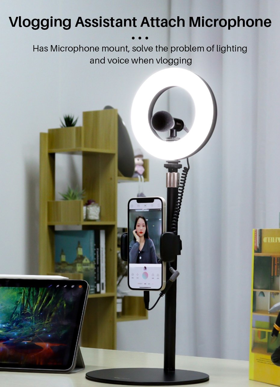 - يوجد حامل ميكروفون ، يحل مشكلة الإضاءة والصوت عند تدوين الفيديو.