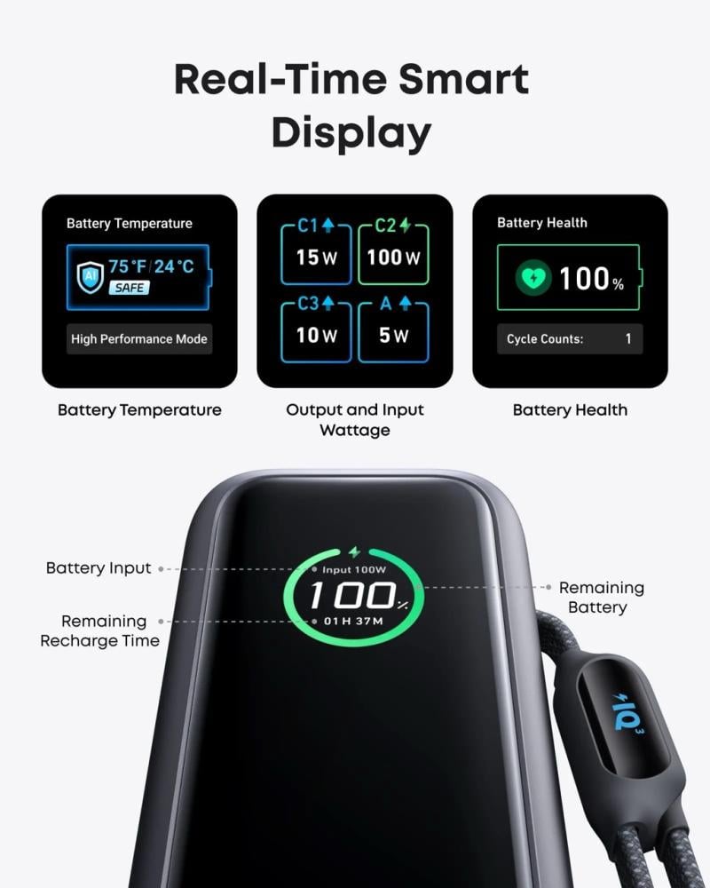 بطارية انكر بسعة 25000 ملي امبير بقوة 165 واط بمنفذ تايب سي ومنفذ يو اس بي مع سلكين تايب سي مدمجة - اسود