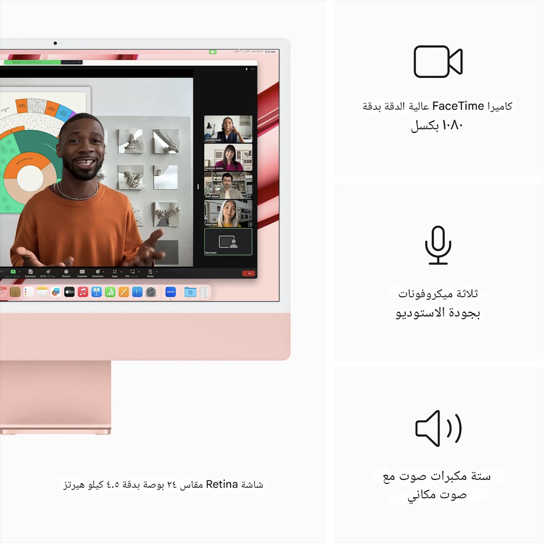 الكاميرا الأمامية بدقة 1080p مزودة بثلاثة ميكروفونات بجودة استوديو ونظام صوتي مكوّن من ست سماعات مع دعم للصوت المحيطي، ما يوفّر تجربة مرئية وصوتية متكاملة أثناء الاجتماعات والمكالمات. يدعم iMac تشغيل تطبيقاتك المفضلة مثل Microsoft 365 وAdobe Creative Cloud وZoom، كما يتيح تشغيل العديد من تطبيقات iPhone وiPad مباشرة على الجهاز.