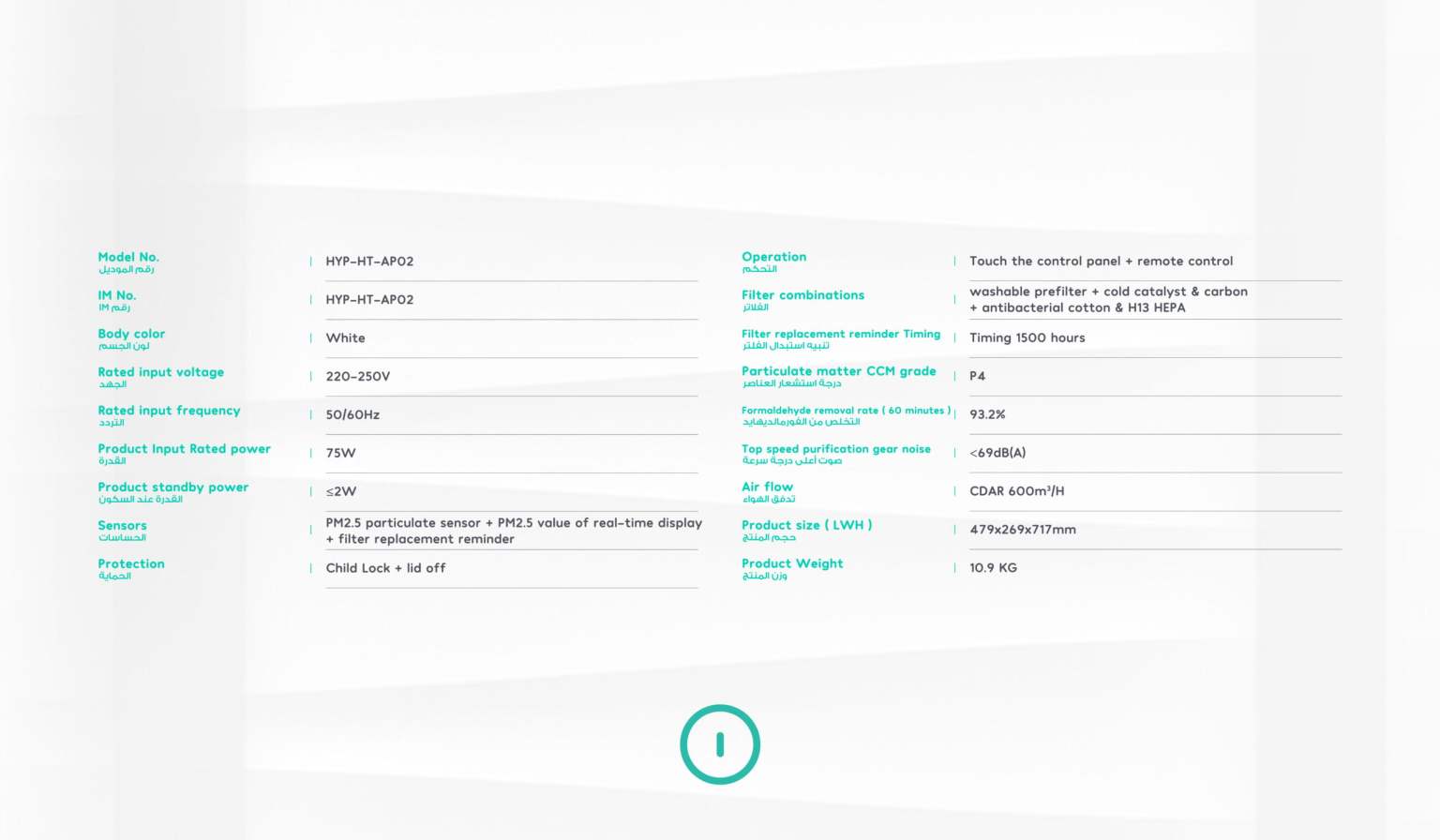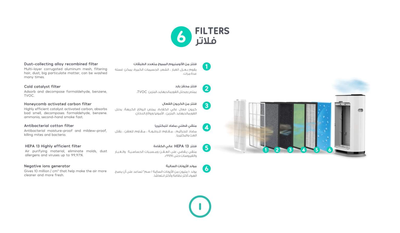 ينتج 10 مليون من الأنيونات المنعشة،6 فلاتر متعدد مع فلتر هيبا 13 عالي الكفاءة، العمر الافتراضي للفلتر 6 شهور كحد اقصى