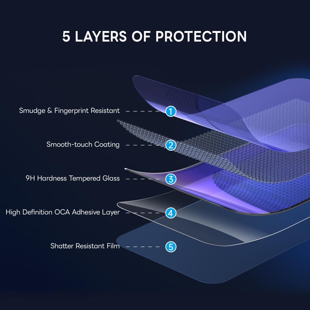 - طبقات الحماية: 5 طبقات (زجاج مقوى، طبقة لاصقة عالية الدقة، طبقة مضادة للكسر...)