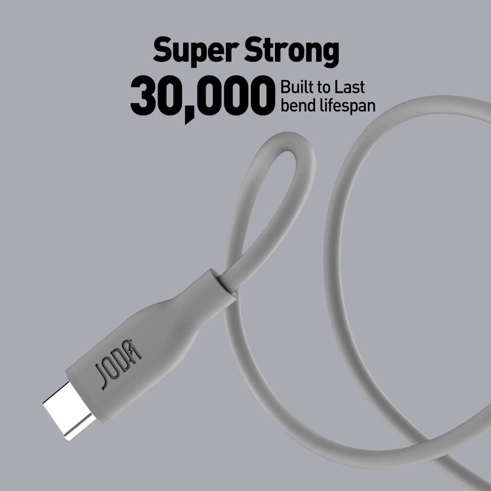 ما يميز هذا الكابل هو تصنيعه من مادة السيليكون المتينة والمرنة. هذا التصميم يمنحه مقاومة عالية للطي والانثناء، حيث يتحمل ما يصل إلى 30,000 طية دون تلف. بالإضافة إلى ذلك، الغلاف السليكوني الناعم والأنيق باللون الرمادي يعطيه مظهرًا جذابًا ومناسبًا للاستخدام اليومي.