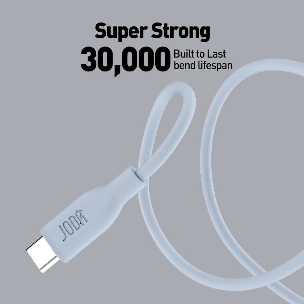 ما يميز هذا الكابل هو تصنيعه من مادة السيليكون المتينة والمرنة. هذا التصميم يمنحه مقاومة عالية للطي والانثناء، حيث يتحمل ما يصل إلى 30,000 طية دون تلف. بالإضافة إلى ذلك، الغلاف السليكوني الناعم والأنيق باللون السماوي يعطيه مظهرًا جذابًا ومناسبًا للاستخدام اليومي.