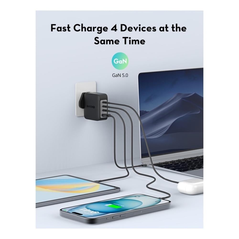 - إمكانية شحن 4 أجهزة في نفس الوقت دون التأثير على سرعة الشحن بفضل تقنية GaN المتقدمة.