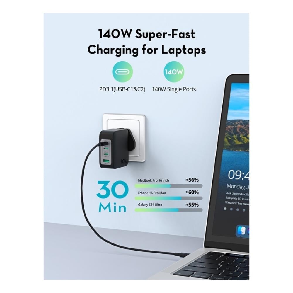 - منفذ PD3.1 USB-C1 & C2: يصل إلى 140 واط لشحن جهاز واحد بسرعة فائقة.