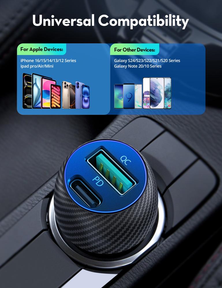 - اشحن جهازين في وقت واحد بفضل الشحن السريع المتزامن، حيث يوفر 25 واط (PD) عبر منفذ Type-C و24 واط (QC) عبر منفذ USB، ما يضمن شحن أجهزتك بكفاءة وسرعة.