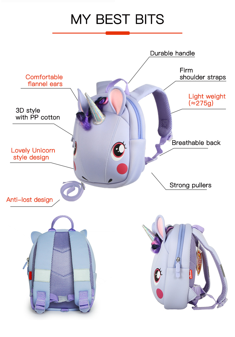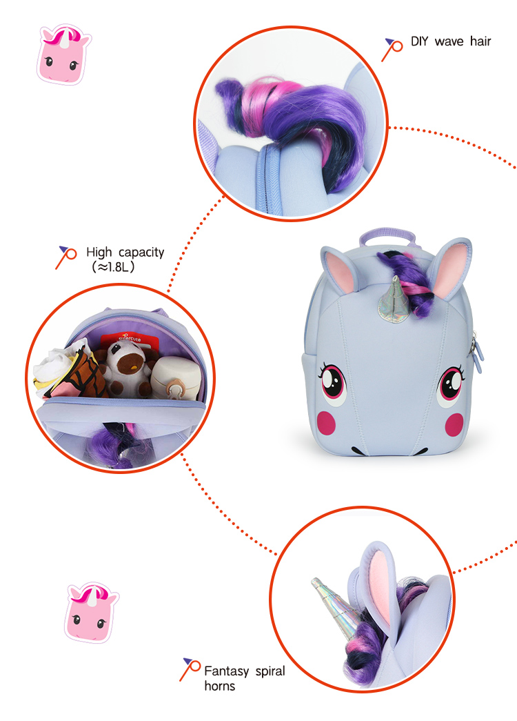 - تصميم فريد: حقيبة ظهر على شكل وحيد القرن لطيف للغاية، تضفي لمسة مرحة على روتين طفلك اليومي.