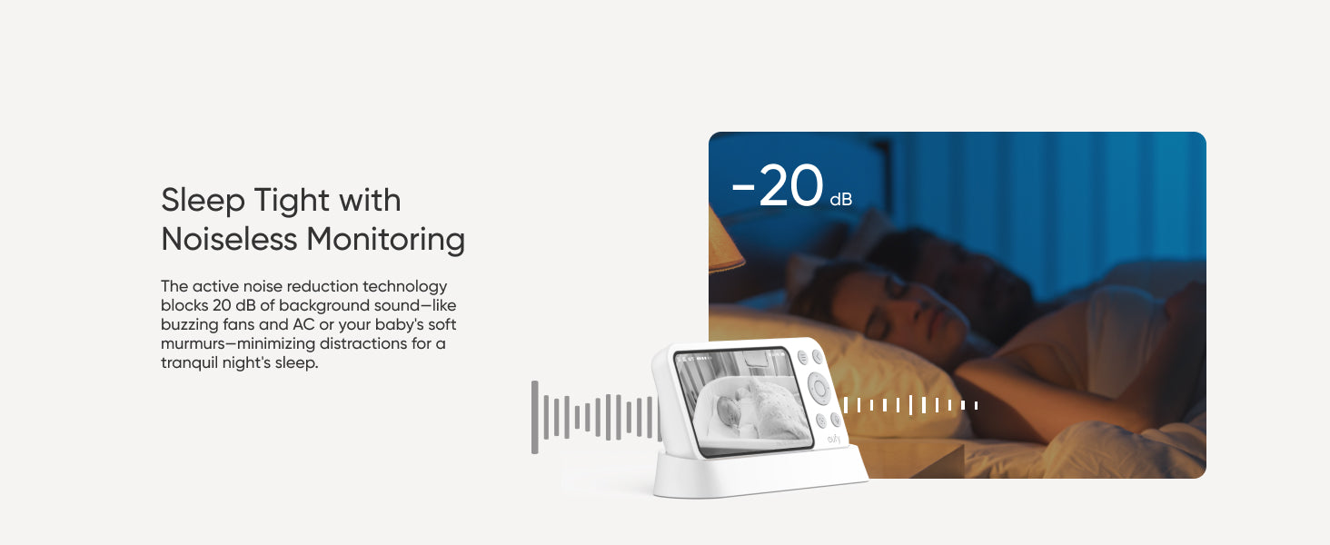 - نوم هانئ مع مراقبة ذكية بدون ضوضاء : استعد لبعض الراحة المستحقة. يأتي الجهاز مزودًا بتقنية تقليل الضوضاء النشطة لخفض الضوضاء في الخلفية بمقدار 20 ديسيبل وينبهك إلى بكاء طفلك وتغيرات درجة حرارة الغرفة والضوضاء الصاخبة. بالإضافة إلى ذلك، يساعدك التسجيل على مدار الساعة طوال أيام الأسبوع في التطبيق على اكتشاف أي مشكلات في النوم قد يعاني منها طفلك.