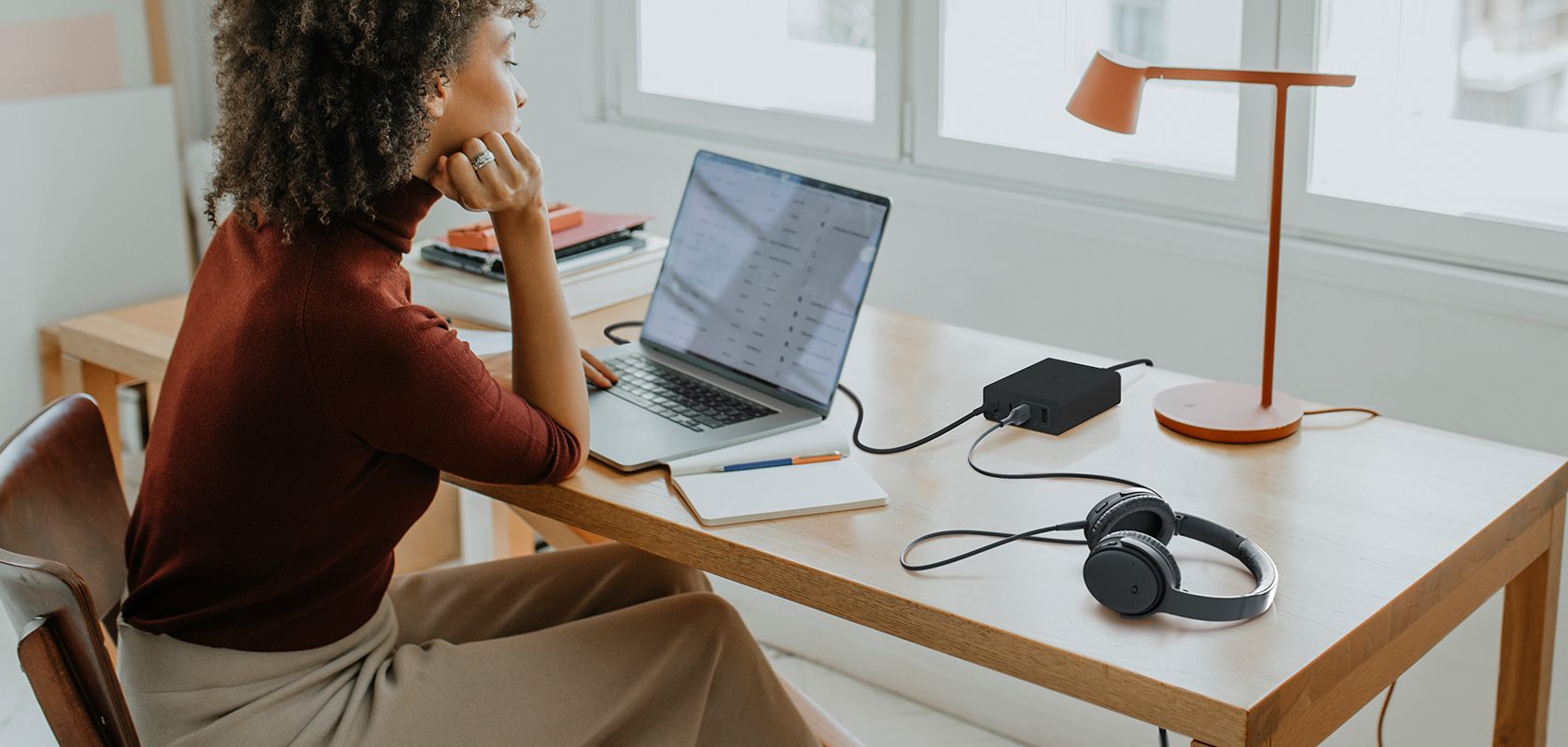 اشحن MacBook Pro بأقصى سرعة أو اشحن بسرعة جهاز iPhone وiPad في نفس الوقت باستخدام شاحن GaN بقدرة 108 واط 4 منافذ. تم تصميم شاحن GaN القوي هذا لوضعه فوق مكتب، مما يتيح لك سهولة الوصول إلى منافذ USB-C و2x USB-A.