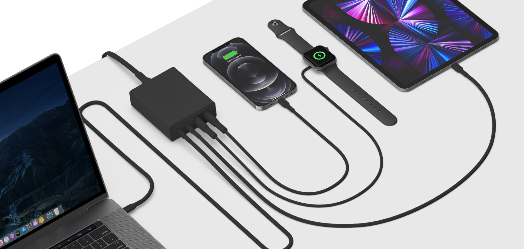 اشحن مجموعة واسعة من أجهزة الكمبيوتر المحمولة والأجهزة اللوحية والهواتف الذكية والمزيد بما في ذلك MacBook وChromebook وأجهزة الكمبيوتر المحمولة USB-C الأخرى وiPhone وiPad والهواتف الذكية Samsung وApple Watch والأجهزة المتوافقة الأخرى.