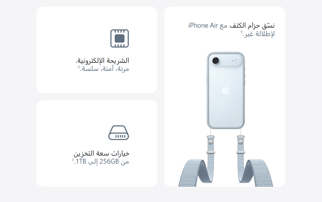- الشريحة الإلكترونية: يتطلب استخدام الشريحة الإلكترونية شركة اتصالات تدعم الشريحة الإلكترونية وباقة خدمة لاسلكية. راجع شركة الاتصالات لمزيد من التفاصيل. لمعرفة المزيد، تفضل بزيارة apple.com/sa-ar/esim