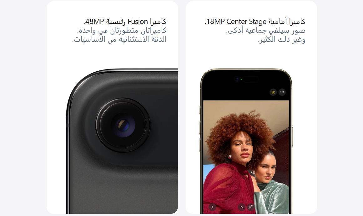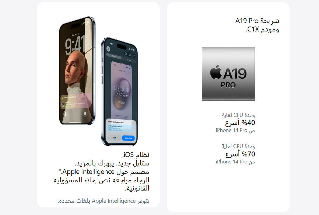 - Apple Intelligence: يتوفر في إصدار تجريبي. قد لا تتوفر بعض الميزات في كل المناطق أو بكل اللغات. لمعرفة المزيد عن توفر الميزات واللغات ومتطلبات النظام، تفضل بزيارة support.apple.com/ar-sa/121115