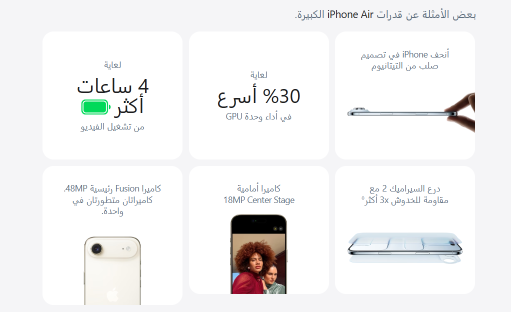- شحن لغاية 50% خلال 20 دقيقة: أجرت Apple الاختبارات في يوليو 2025 باستخدام وحدات iPhone 17 وiPhone Air وiPhone 17 Pro وiPhone 17 Pro Max خاصة بمرحلة ما قبل الإنتاج وبرامجها، وكابل شحن USB‑C مع محول طاقة ديناميكية بقدرة 40 واط وقدرة قصوى 60 واط من Apple (موديل A3351)، وشواحن MagSafe من Apple (موديل A3502 بطول 1 متر وموديل A3503 بطول 2 متر) مع محول طاقة USB‑C من Apple بقدرة 30 واط (موديل A2164) بالإضافة إلى محول طاقة ديناميكية بقدرة 40 واط وقدرة قصوى 60 واط من Apple (موديل A3351). تم إجراء اختبار الشحن السريع على وحدات iPhone فارغة الشحن. تم قياس الأوقات من لحظة ظهور شعار Apple عند بدء تشغيل الوحدة. تختلف مدة الشحن بحسب محول الطاقة والإعدادات والاستخدام والعوامل البيئية، وتختلف النتائج الفعلية.