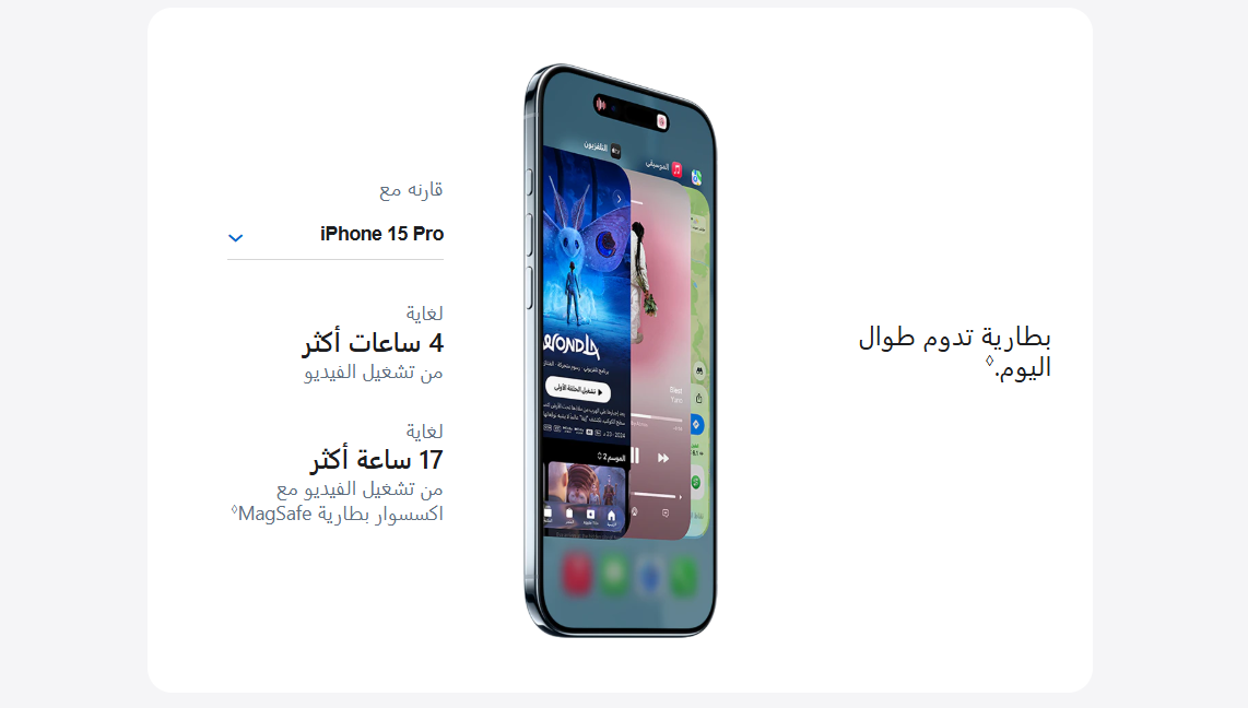 - الطاقة والبطارية: تعتمد جميع المواصفات المذكورة للبطارية على إعدادات الشبكة والعديد من العوامل الأخرى، وتختلف النتائج الفعلية. للبطارية عدد محدود من دورات الشحن وقد تضطر إلى استبدالها بعد فترة. يختلف عمر البطارية ودورات الشحن بحسب الاستخدام والإعدادات. راجع apple.com/sa-ar/batteries وapple.com/sa-ar/iphone/battery.html لمزيد من المعلومات.