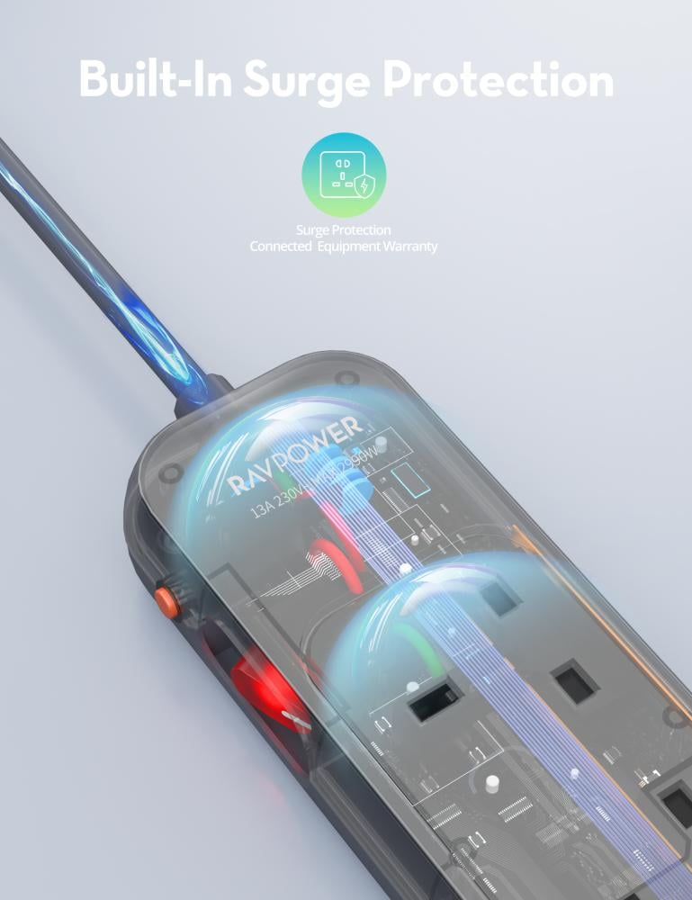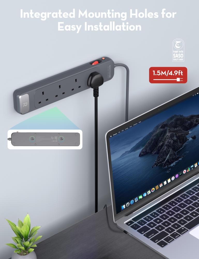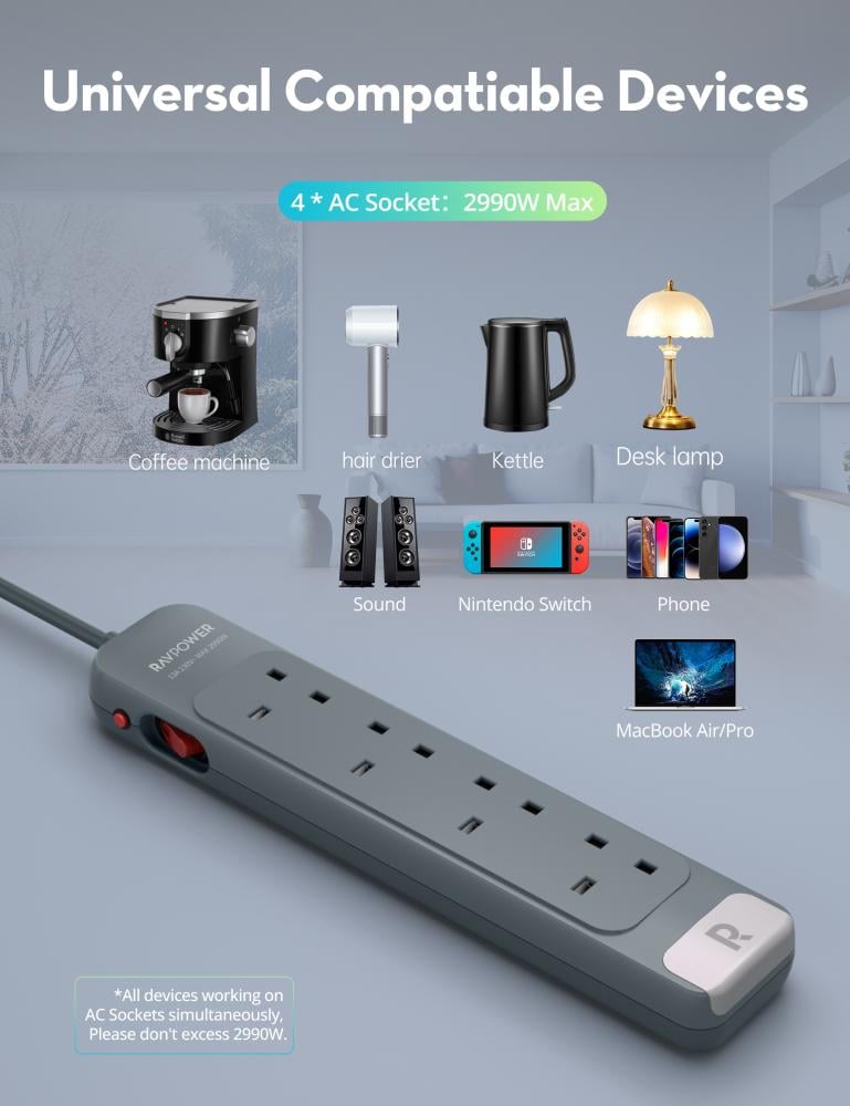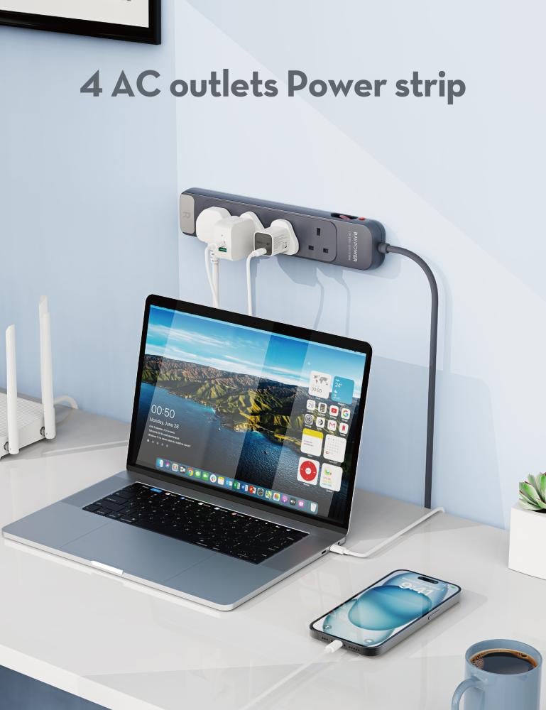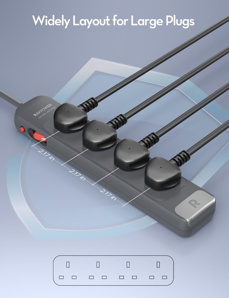 - عدد المنافذ: 4 مقابس تيار متردد بتخطيط واسع يناسب المقابس الكبيرة.